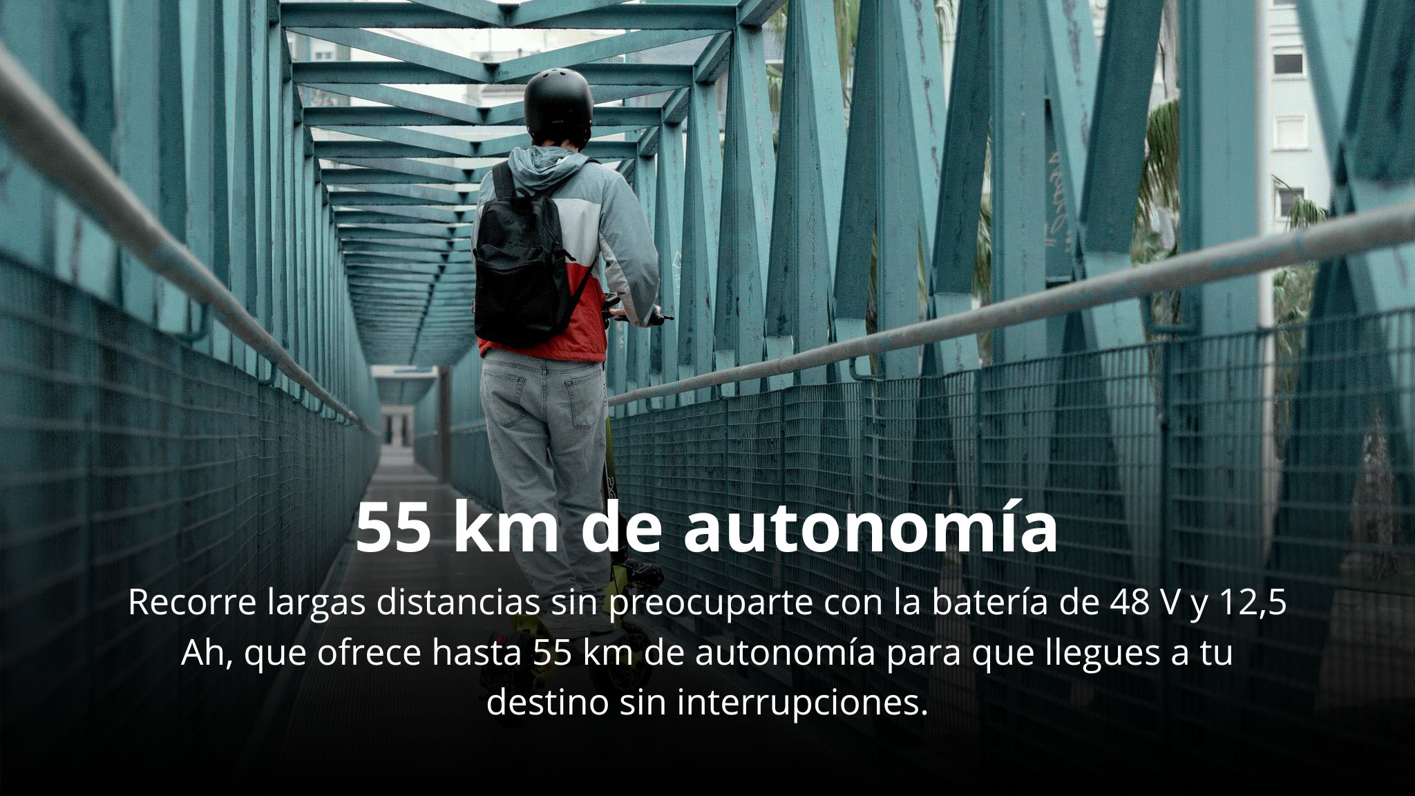- Alcance superior para viajes largos. Equipado con una batería de alta capacidad de 48 V y 12,5 Ah, disfruta de una impresionante autonomía de hasta 55 km. Ideal para desplazamientos diarios y aventuras prolongadas, sin preocuparte por recargarla.