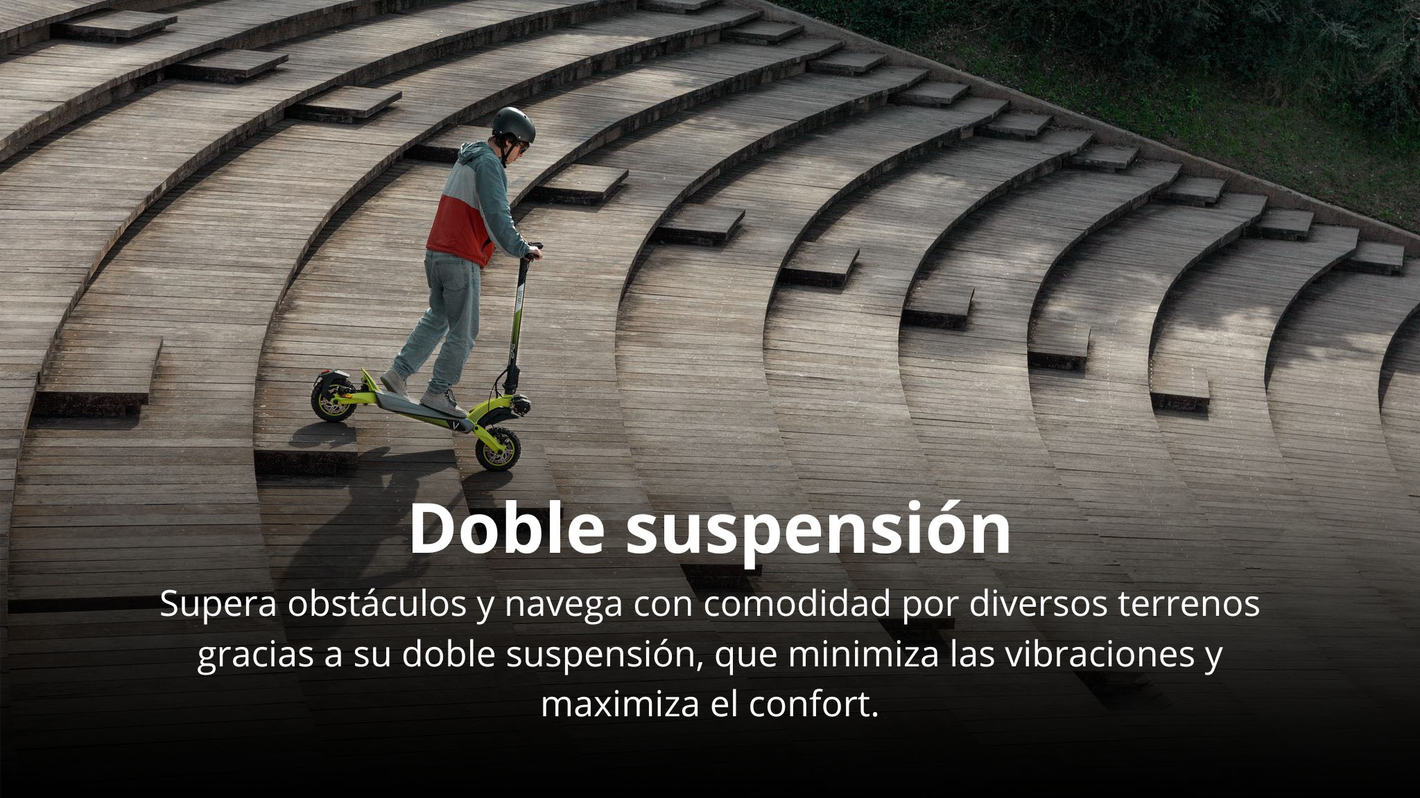 - Conducción cómoda y estable en cualquier superficie. La avanzada doble suspensión asegura una experiencia de conducción suave y confortable, absorbiendo los desniveles del terreno y proporcionando estabilidad en todo momento.