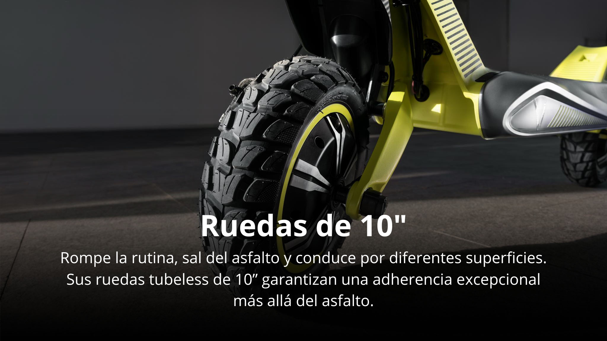 - Máxima adherencia y control. Las ruedas de 10″ ofrecen un agarre y estabilidad óptimos, permitiéndote enfrentar cualquier desafío en la carretera con seguridad y confianza.