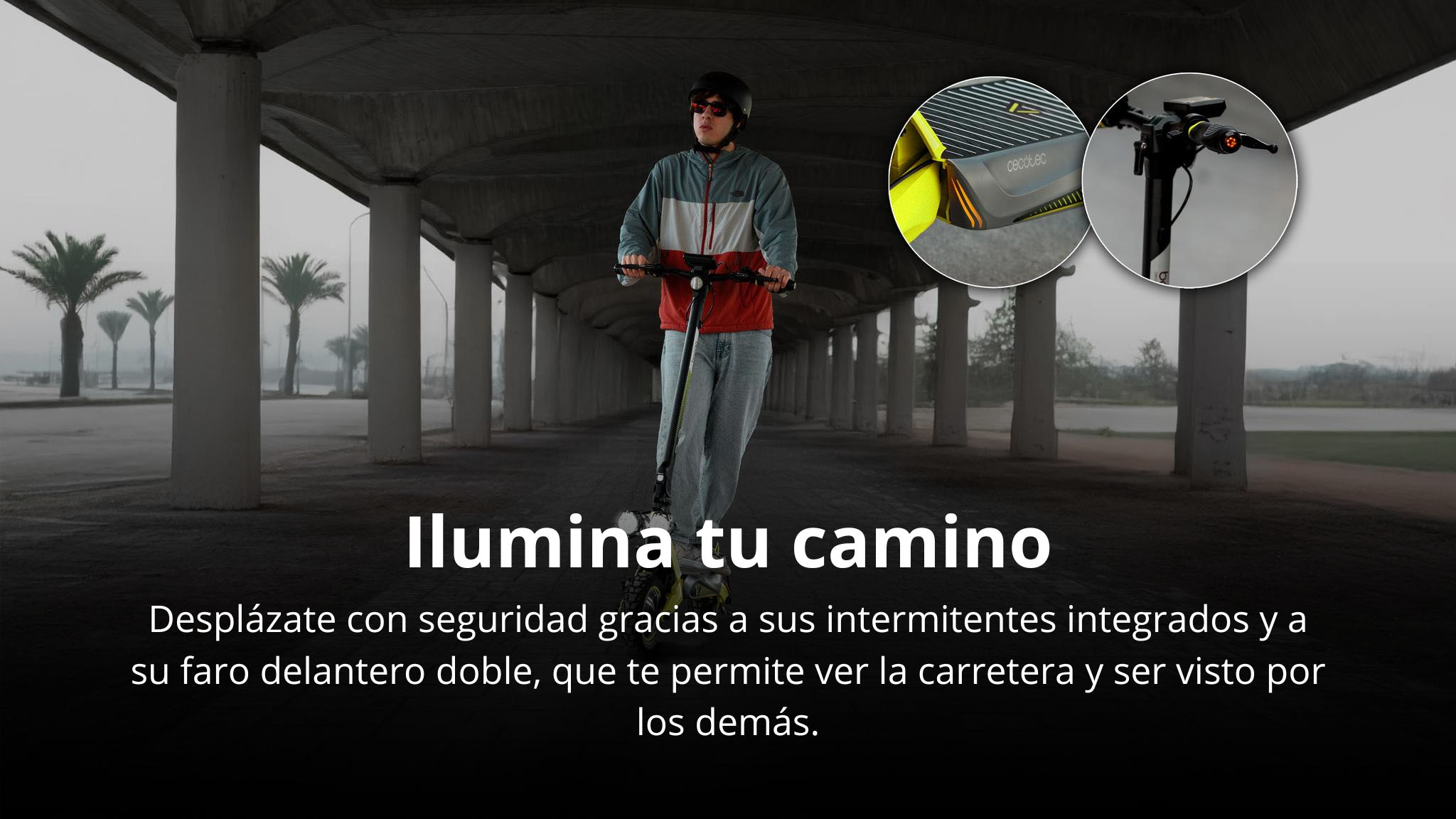 - Mejora de visibilidad y seguridad. Equipado con intermitentes y un potente faro doble, este patinete asegura que seas claramente visible para los demás, incluso con poca luz, aumentando tu seguridad al conducir de noche.