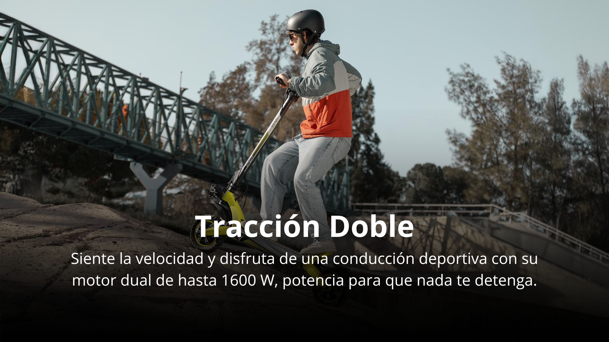 - Supera cualquier terreno sin esfuerzo. Con sus dos motores de 800 W (500 W nominales cada uno), este patinete ofrece tracción doble que te permite afrontar pendientes y superficies difíciles con facilidad, garantizando una conducción potente y eficiente en cualquier situación.