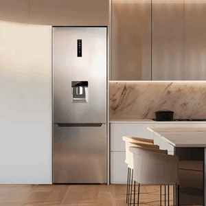 Bolero CoolMarket Combi 322 WD Inox E Frigorífico combi inox, 185,5cm de alto y 59,5 cm de ancho, con 322 litros de capacidad, compresor Inverter Plus, Total No Frost, dispensador de agua, clase energética D y con sistema Multi Air Flow. Además, cuenta con el modo Fast Cooling.